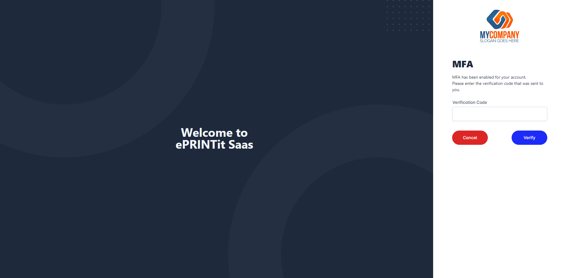If the multi-factor authentication (MFA) is enabled for the user, the following screen will be displayed requesting the MFA code that should be sent to the user. For more information about MFA, click here.