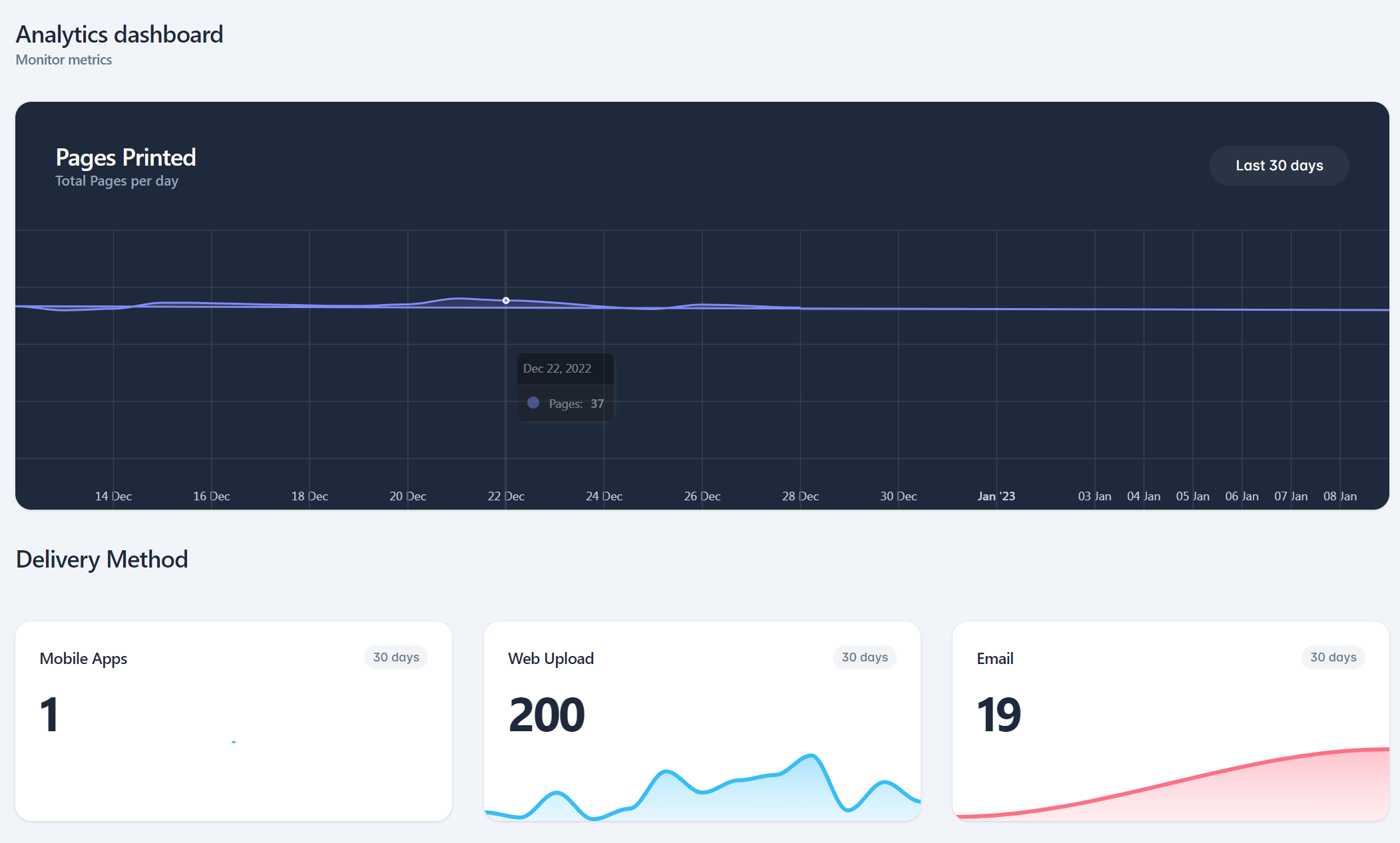 The ePRINTit SaaS Analytics Dashboard provide the overview regarding the pages printed per day in the last 30 days and the delivery method (Mobile, Web Upload and Email).This information displayed in this format; allows business owners to save time and improve their decision making.