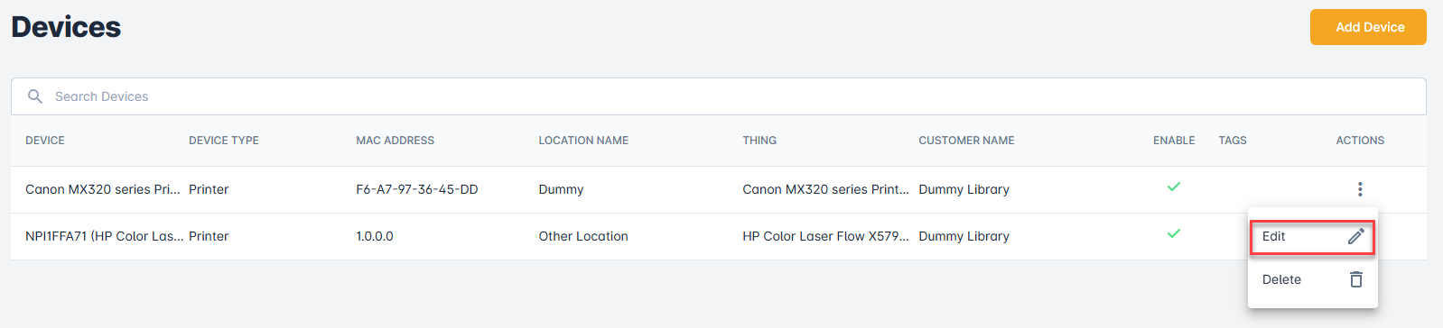 To access the Device screen, the user simply needs to login to the ePRINTit SaaS and on the menu bar navigate to the Things/Devices area. This feature is managed by permissions and the user must be associated to a group that allows the user to access this option. To get more information about groups and how to associate it to a role type that has this permission, click here.