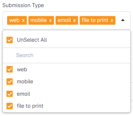 Select the submission type that should be considered in the report. Submission type is the source where the files were submitted (web, mobile, email and file to print).