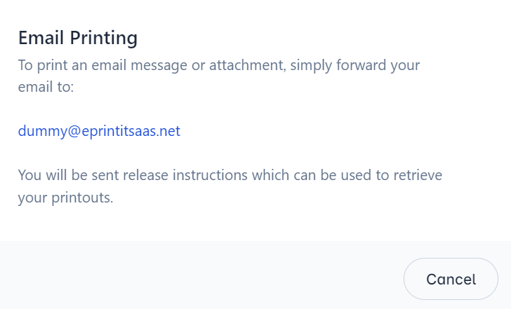 This field displays information about how to print the documents by sending them to an email address. This email is assigned during the customer onboarding. For more information about how the email printing address, click here.