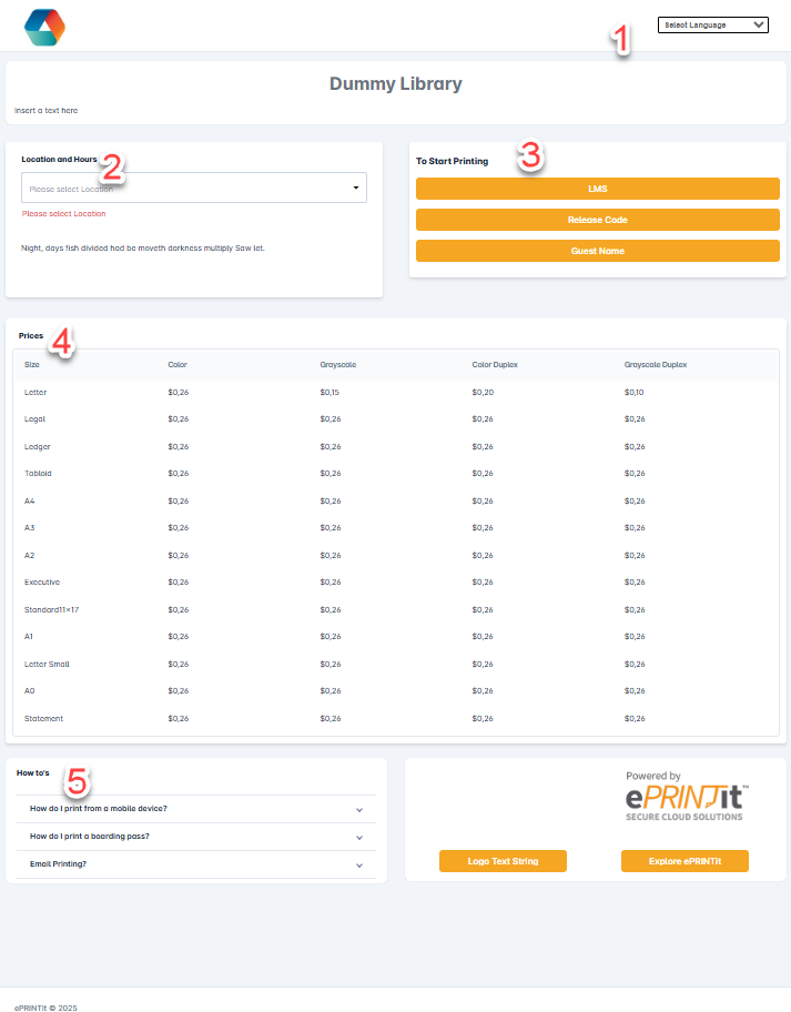 The Public Upload Page allows users to upload files to the ePRINTit SaaS system to be printed in the future. The file types supported are configurable and may vary depending on the customer. To get more information about how to configure the file type supported, click here. To get more information about how to configure how long the files will be available for printing, click here.