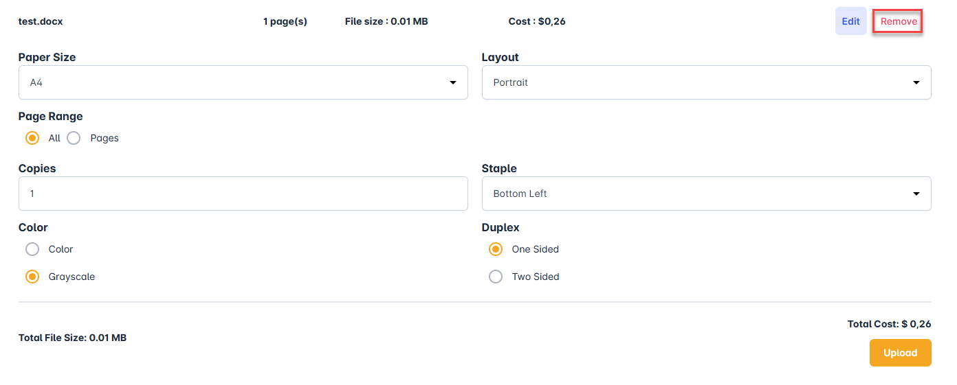 After uploading a file, in case the user decides to not upload a specific file, click on Remove button and the file will not be uploaded.