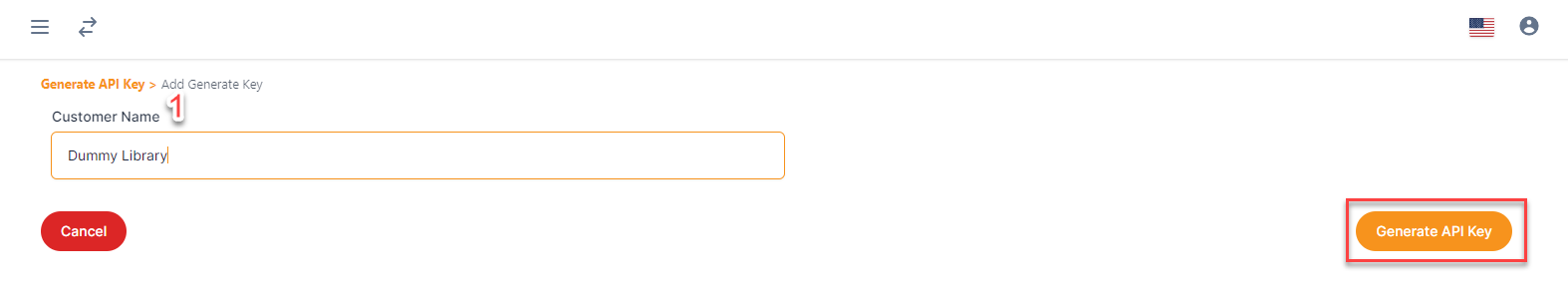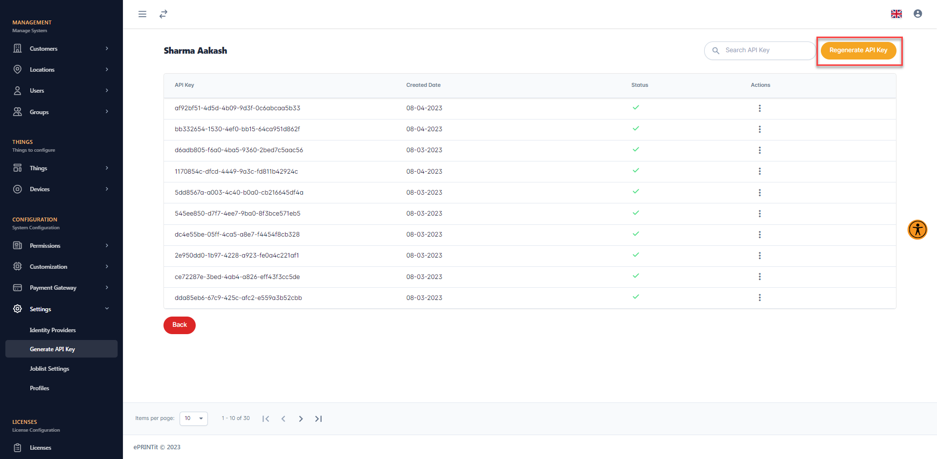 The Generate API Key screen is a user interface that allows the user to generate the API key secret, to be used by partner customers to generate results using Swagger (Swagger UI (eprintitsaas.org)), and use the available APIs in the development environment, without accessing the ePRINTit SaaS web portal.