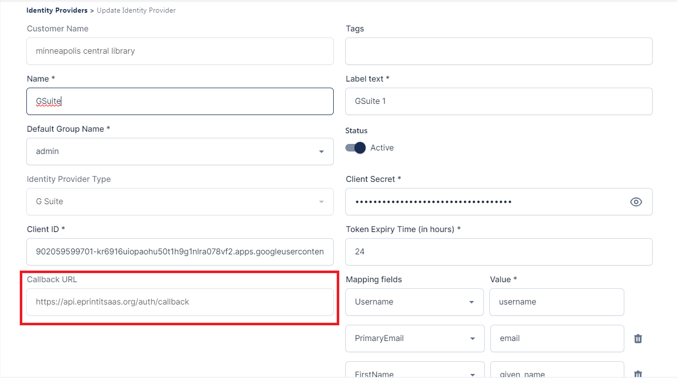 After adding the G Suite Identity Provider, when you edit that identity provider then you will see the Callback URL section. This callback URL helps customers by redirecting them to us.
