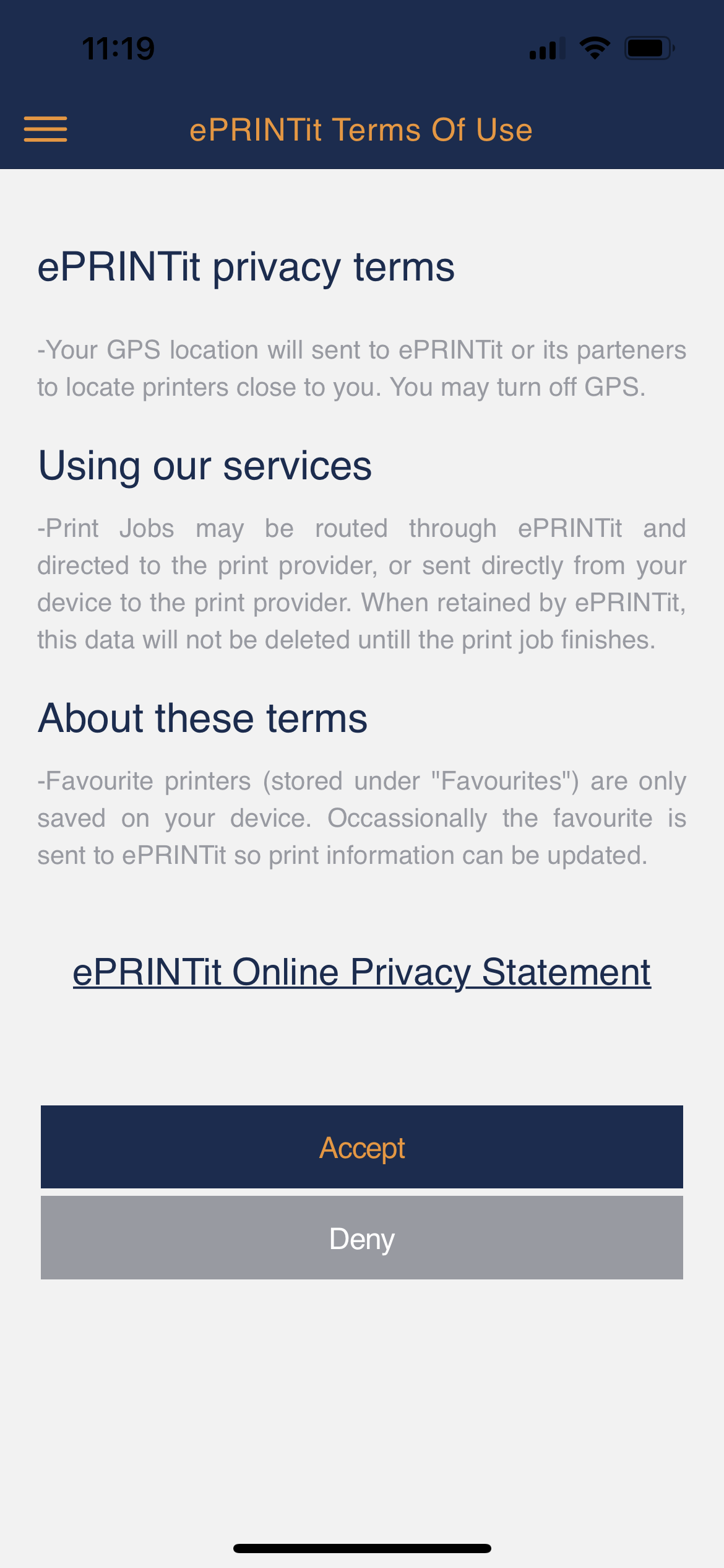 Read the privacy terms and accept it. A new screen will be displayed with the options from where you can select your file to be uploaded in the ePRINTit SaaS system for printing. In this screen you can also configure the location/device to where you are going to print your files.