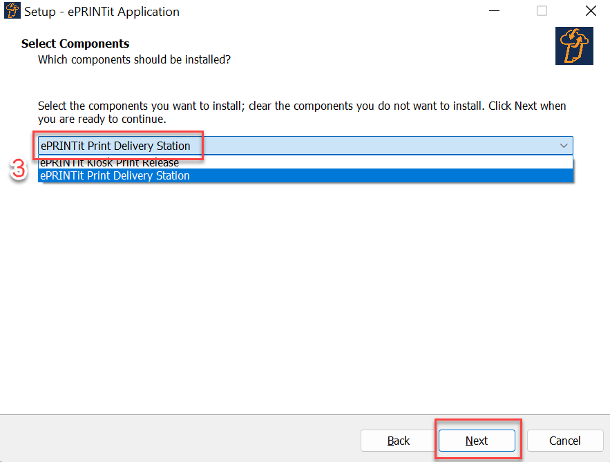 In the components combo box, select the ePRINTit Print Delivery Station component and click on Next button.