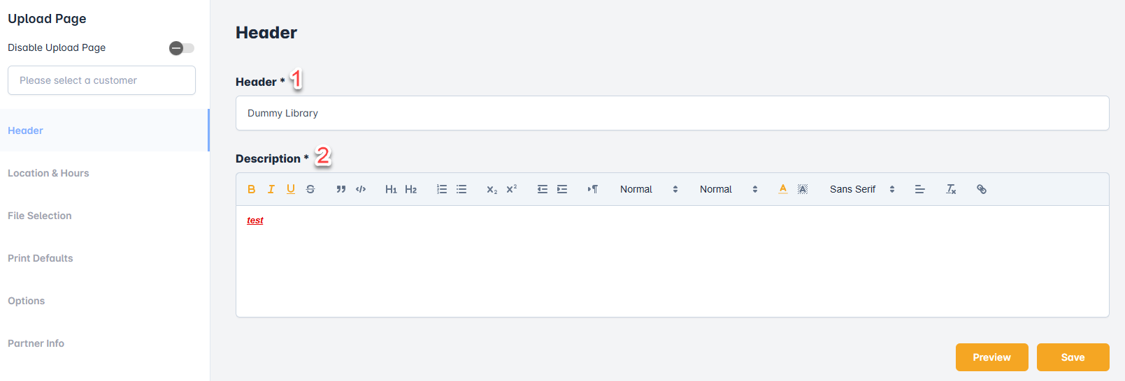 The Preview button allows users to preview the Customer Upload Page before saving any changes. This feature provides a visual representation of how the upload page will appear after applying the current configuration settings, helping users verify the layout and design before finalizing their setup.