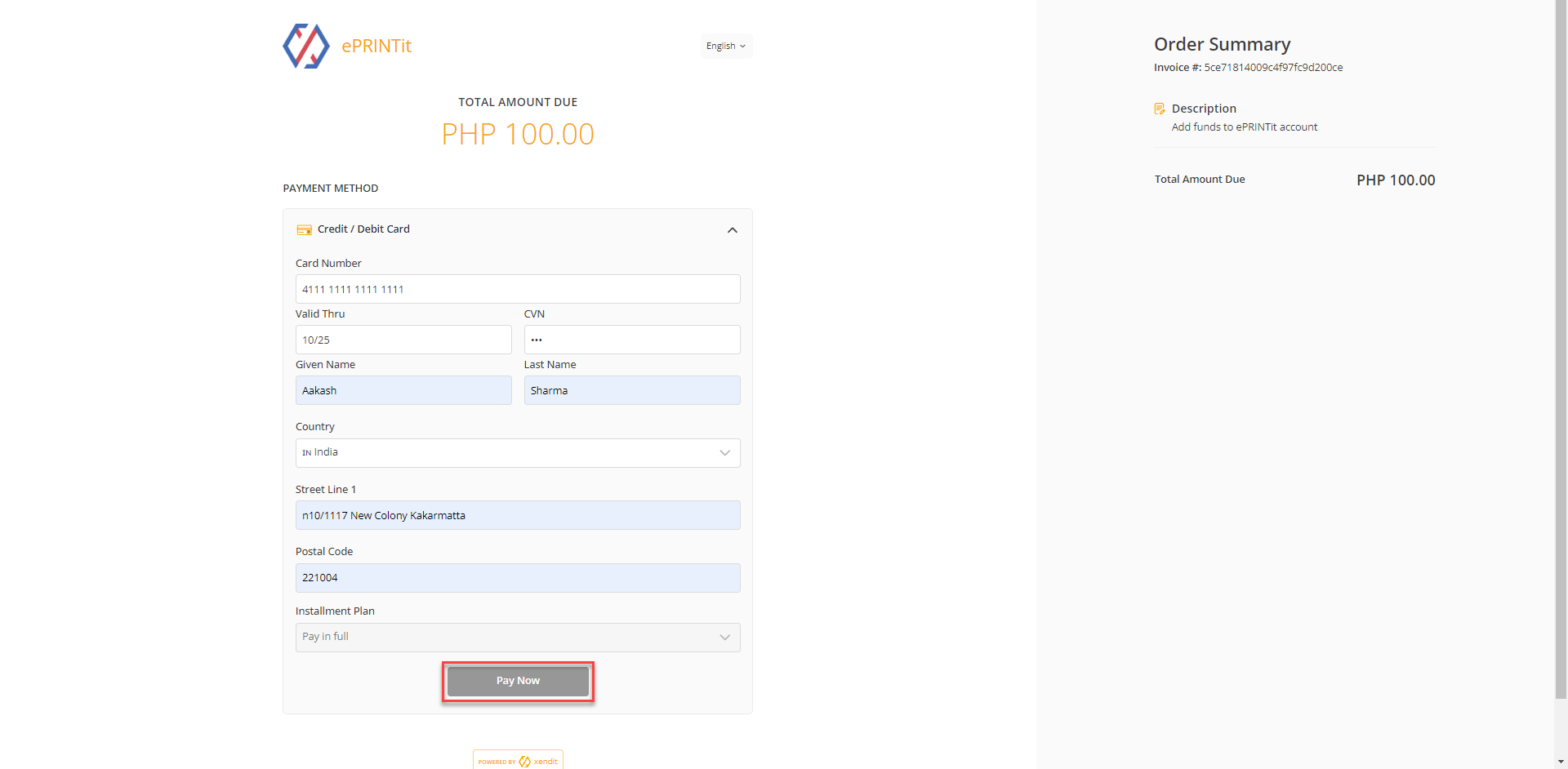 Xendit page will open. Type all necessary information and click on Pay Now button.